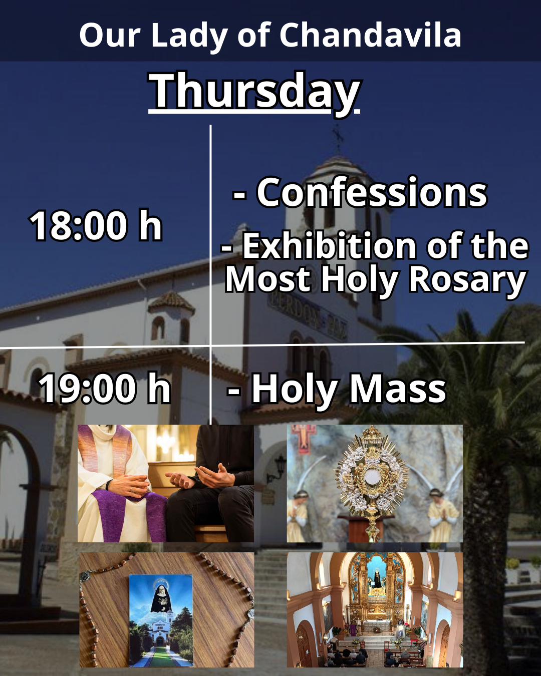 Confessions, Exposition of the Holy Rosary and Holy Mass